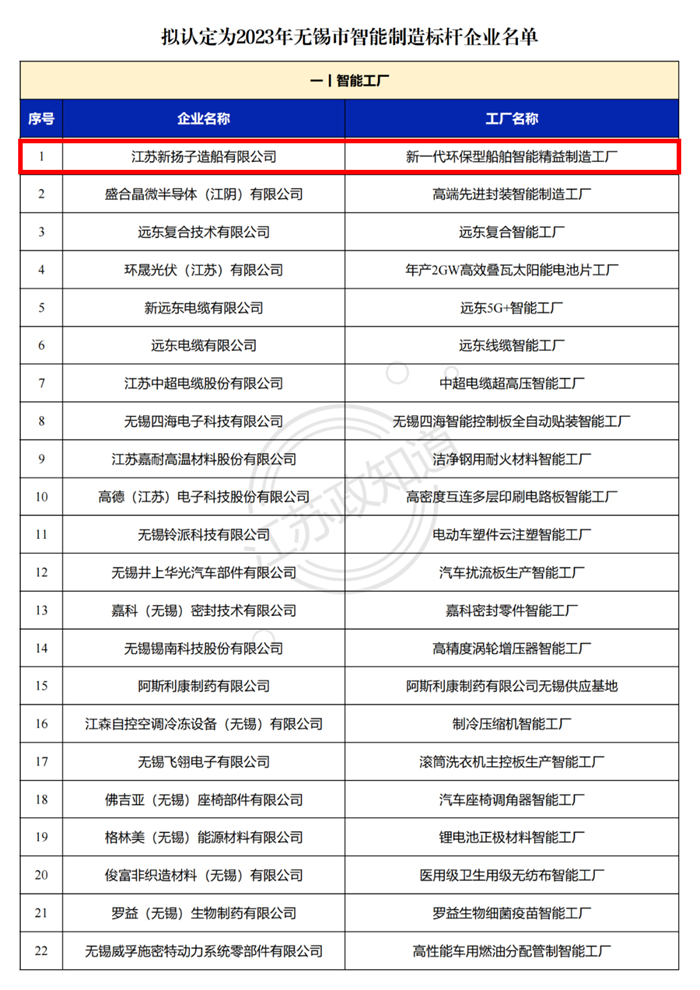 我集團江蘇新?lián)P子造船有限公司被認定為“2023年無(wú)錫市智能制造標桿企業(yè)”。