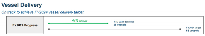截止2024年5月24日,集團各子公司已按期(或提前)交付1800TEU、2400TEU、3300TEU、3500TEU、7000TEU雙燃料、15000TEU、16000TEU多型集裝箱船;散貨船有29800DWT、63200DWT、40000DWT、45000DWT、82000DWT、82500DWT等船型。此外交付一艘40000m3雙燃料液化石油氣/液氨運輸船,集團首次涉足的甲醇燃料動(dòng)能船型——1260TEU甲醇雙燃料集裝箱船首制船也按期順利交付。截止目前,集團今年已交付新造船28艘,完成年度交付計劃63艘中的約44%。