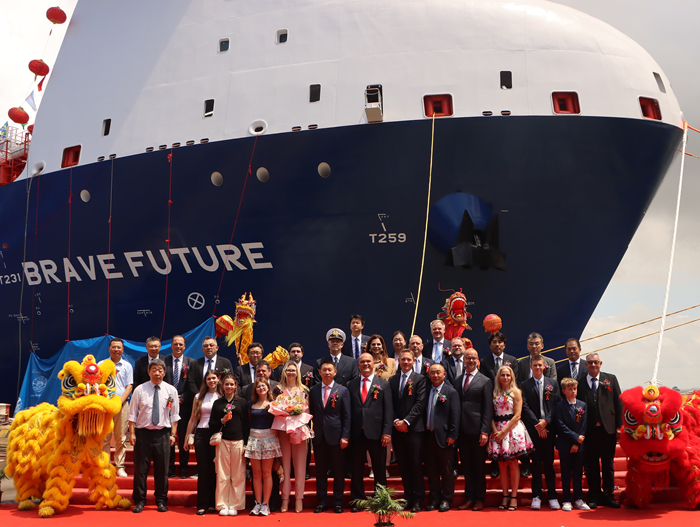 7月9日上午,揚子三井為該船舉行了隆重的命名儀式。教母Cristiane Rego女士,Ocean Yield COO Andreas Reklev先生,Braskem貿易及運輸CEO Hardi Schuck先生,Hartmann集團CEO Niels Hartmann博士、董事會(huì )執行總監Adami Ulrich先生、新造船總監Ionut Cornea先生、大中華區區域經(jīng)理龍葉飛先生,DNV船級社高級副總裁兼海事大中國區總經(jīng)理Norbert Kray先生、中國北方區總經(jīng)理晏曉琳女士,我集團副總經(jīng)理兼揚子三井總經(jīng)理宋書(shū)明先生,集團副總經(jīng)理吉宏飛先生、揚子三井COO府木公一郎先生、COO田村光路先生、CFO石丸雄次先生、副總經(jīng)理陳國強先生、CMO中尾慎一先生、總經(jīng)理助理楊立峰先生以及各合作方、員工等代表參加了命名儀式。