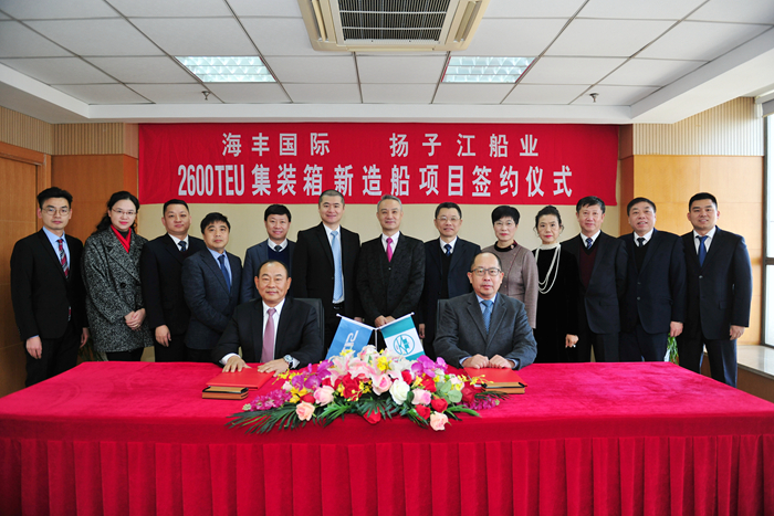 我集團與海豐國際本年度第三次合作,12月19日,雙方共同簽署6+2+2艘2600TEU集裝箱新造船建造合同。集團董事長(cháng)任樂(lè )天先生,集團副總經(jīng)理杜成忠先生、張濤先生,海豐國際董事局副主席兼首席執行官楊現祥先生攜夫人,海豐航運集團副總裁肖森元先生,上海海事大學(xué)校長(cháng)陸靖先生,上海海事大學(xué)商船學(xué)院黨委書(shū)記曹紅奮女士,上海海事大學(xué)商船學(xué)院院長(cháng)肖英杰先生,上海船舶研究設計院院長(cháng)呂智勇先生等共同見(jiàn)證新訂單成功簽約。